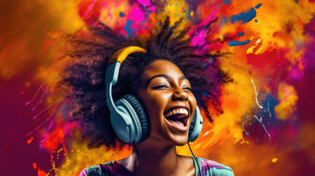 Silhouette of a young female singer wearing headphones, enjoying music with colorful notes and paint splatters exploding from her mind, creating a vibrant and energetic atmosphere