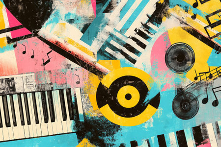 Grunge style background with various musical instruments and vinyl records. Contemporary art collage