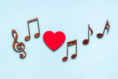Love songs - musical wooden notes with heart, top view