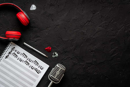 Music background with music keys, headphones, microphone, recorder, top view.