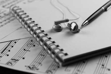 Sheets with music notes and headphones. Compose music concept