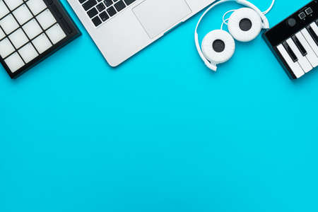 Top view of home studio music production equipment with copy space. Minimalist photo of bedroom producer setup over turquoise blue background. Modern beatmaker essential studio equipment.