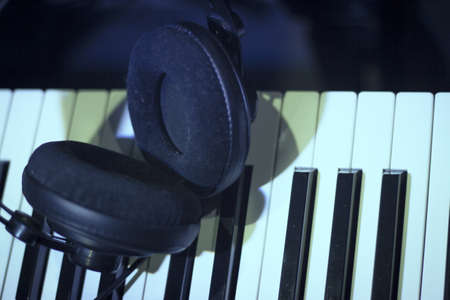 Headphones on musical synthesizer keyboard. Headphones on electronic piano. Musical background
