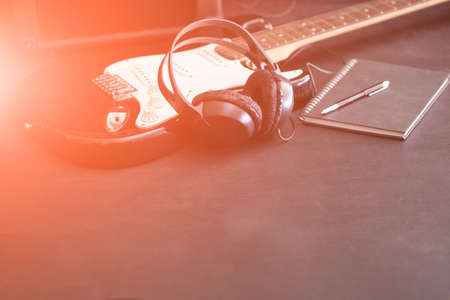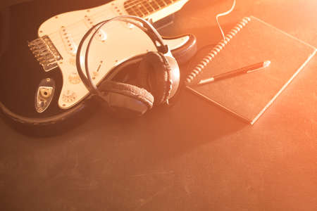 Music notes, Guitar and headphone on stage