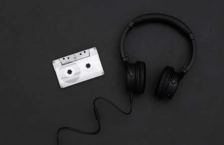 Retro audio cassette and headphones on a black background. top view