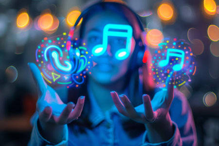 Explore a captivating display of glowing light trails depicting musical notes in vibrant motion. A stunning representation of creativity and rhythm.