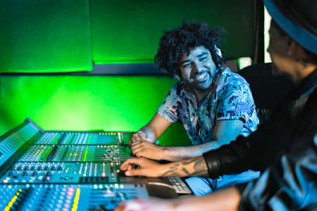 Young Audio Engineers Working in Music Recording Studio creating and mixing sounds - Youth musician people lifestyle concept
