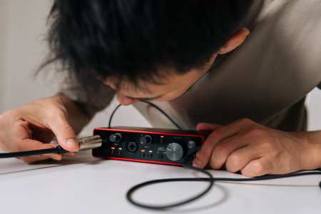 Close-up of man preparing digital audio workstation, connecting input cable to red usb audio interface, setting up sound recording equipment for music production in home studio environment.