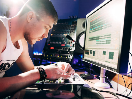 Close-up of composer working on audio equipment, he writing songs in digital recording studio