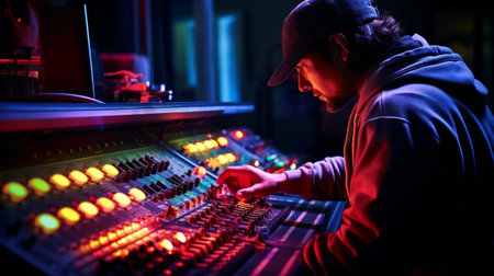 A music producer adjusting controls on a glowing audio mixer in a dark studio