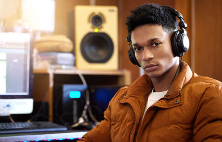 Im serious about sound. Cropped portrait of a handsome young male music producer working in his home office.