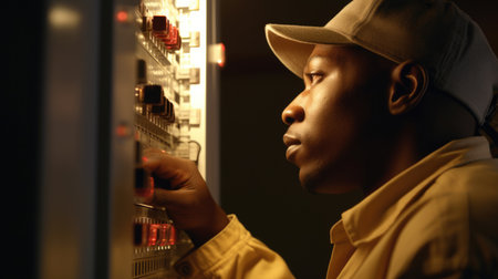 Electrician Male African-American Middle-Aged Installing and repairing electrical systems and equipment in Commercial building. Generative AI AIG22.