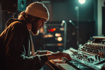 A man focuses on playing a synthesizer in a music studio, illuminated by soft lighting during evening hours.