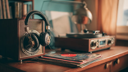 A cozy vintage audio setup featuring headphones, a turntable, and a record collection, perfect for those who appreciate classic sound and nostalgic living spaces.