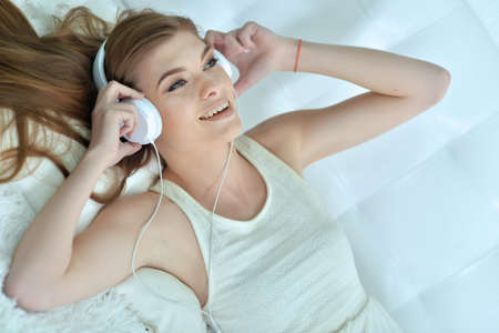 girl in headphones listens to music and dances, in belots shirt, soft focus, studio