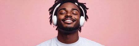 Smiling young man wearing headphones, pastel pink backdrop, clean, simple mockup design, banner