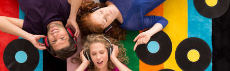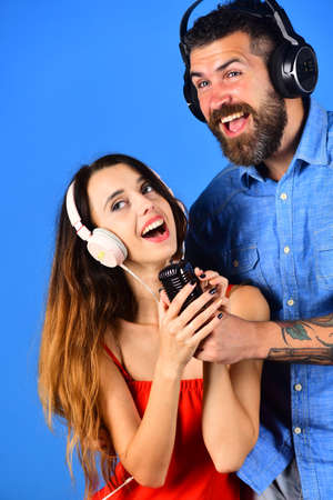 Beautiful young smiling couple in headphones listening music while standing against blue background