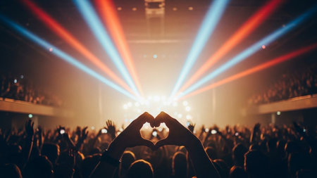 Image of heart icons over diverse people during concert. world heart day and celebration concept digitally generated image.