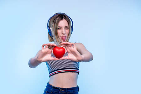 Young modern happy caucasian girl listening to music with headphones with a light blue background - Studio photography of pretty model woman with rubbery red heart looking at the camera making tongue