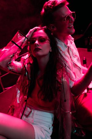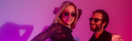 Smiling woman in sunglasses dancing with boyfriend during party on purple background, banner