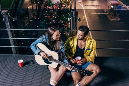 high angle view of handsome boyfriend with plastic cup and attractive girlfriend playing acoustic guitar in night city