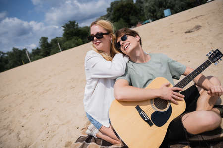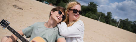 young woman in sunglasses embracing boyfriend with acoustic guitar on beach, banner