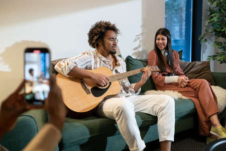 African young man playing guitar for his friends sitting on sofa in the living room while woman making a photo on her mobile phone