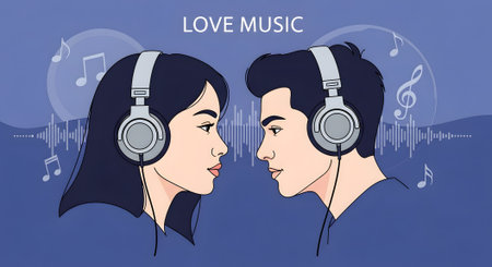A man and a woman face each other, both wearing headphones, with musical notes and sound waves in the background, illustrating a shared love for music and connection.
