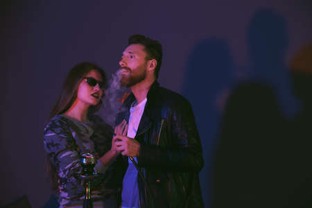 Hipster love Funky young couple wearing sunglasses and smiling while standing against colorful background : Generative AI