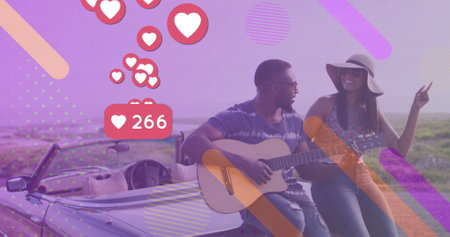 Image of hearts and number over happy diverse couple sitting at cabriolet and playing guitar. travel, holidays, relationship and freedom concept digitally generated image.
