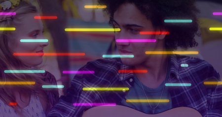 Strumming musician with partner sitting on wooden bench in park, with guitar and colorful bars. Romantic, connection, leisure, harmony, vibrant, acoustic, outdoor