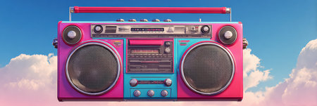Colorful boombox with blue and pink design sits prominently under a bright sky and soft white clouds, evoking a nostalgic vibe and energy.