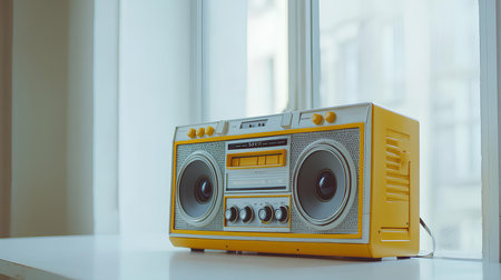 Yellow boombox on the table in the room. Vintage style.