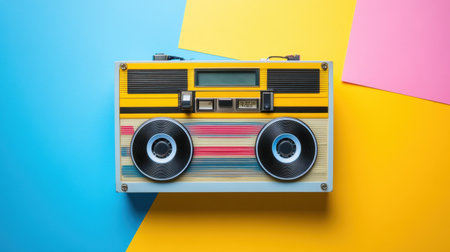 A vibrant retro boombox set against a colorful background featuring bright yellow and pink papers, perfect for nostalgic themes in various creative projects.