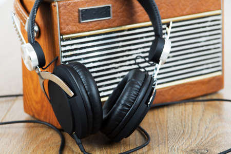 Headphones and old vintage radio on wooden surface