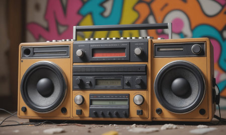 A vintage boombox with graffiti art in the background, showcasing retro vibes and urban culture. --chaos 30 --ar 16:9 --v 6.1 Job ID: 00124295-0523-4670-9ef2-a93e28dbebc8