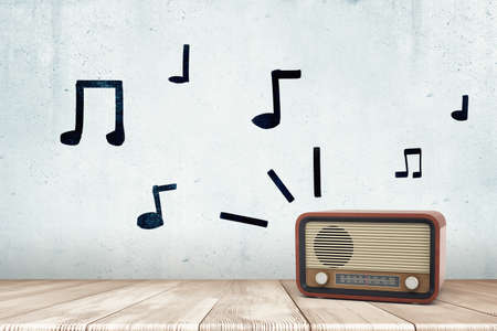 3d rendering of a retro radio receiver on a wooden surface and hand-drawn musical notes on the wall.