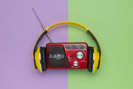 Retro Red Radio and Yellow Headphones on Colorful Split Background