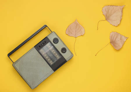 Retro fm radio receiver on a yellow background with fallen autumn leaves. Top view