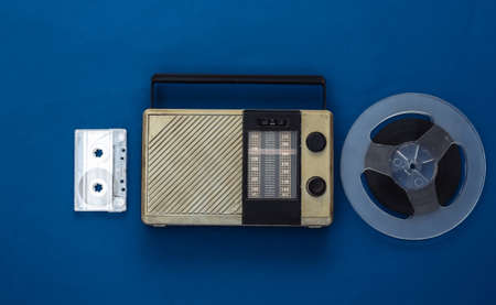 Portable radio receiver, audio cassette and magnetic tape reel on classic blue background. top view. Music 80s