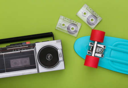 Retro old school attributes 80s on green background. top view. flat lay