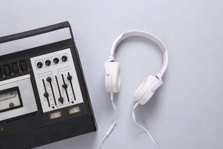 80s Retro outdated portable stereo cassette recorder and radio receiver, headphones, audio cassette on white background. Attributes 80s, retro media, entertainment