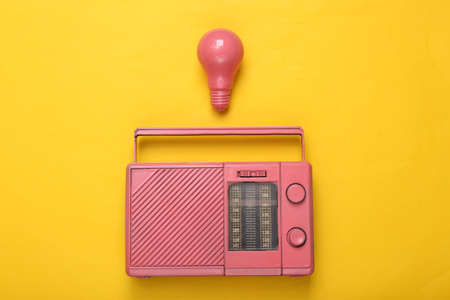 Pink cool radio receiver and light bulb on yellow background. Minimal musical concept. top view. flat lay