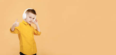 Caucasian little girl in white headphones enjoys music. happy girl in headphones. listening to music. Pink background. copy space