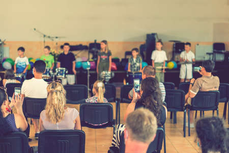 Childrens holiday in elementary School. Children on stage perform in front of parents. image of blur kid s show on stage at school , for background usage. Blurry. toned