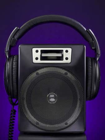 Stereo speaker on purple colored background. Sound audio loud speaker with copy space