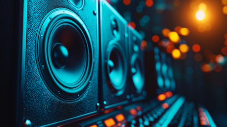 A Close up of modern speakers in music studio, showcasing vibrant colors and intricate details. atmosphere is energetic and creative, perfect for music production