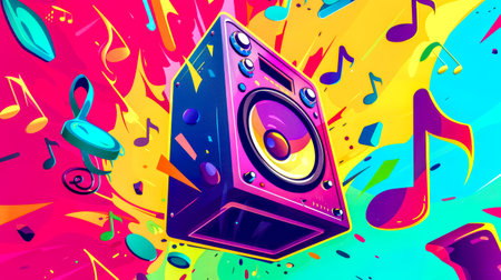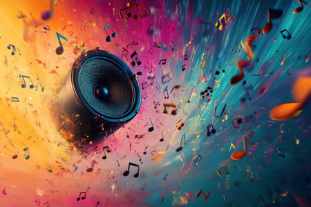 A colorful explosion of music notes and a speaker. The speaker is surrounded by a cloud of notes, creating a sense of chaos and excitement. Concept of music and its power to evoke emotions