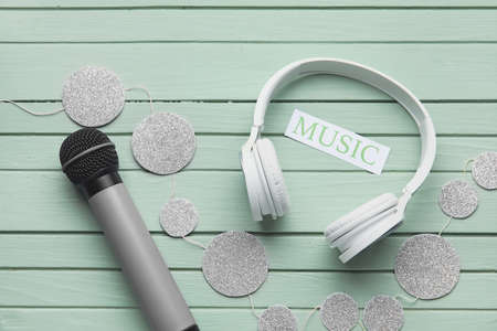Microphone with headphones and confetti on dark wooden background