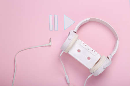 Stereo headphones with audio cassette, icons start and pause of media player on pink background. Music day. top view